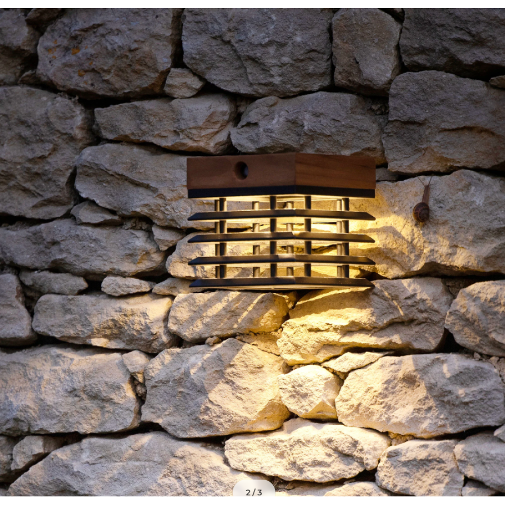 The Tekura Sconce is available in teak or weathered teak with slate grey HPL.