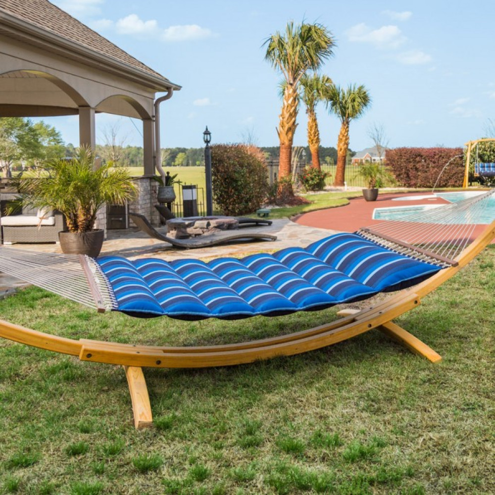 The cry of a gull passing overhead is sweetest music to a sea-starved soul craving that special serenity that only the ocean can bring. For someone too long landlocked, nothing can replace actual time at the beach – though this lovely quilted hammock makes a fantastic holdover in the meantime! With its cool blue stripes this pattern evokes a peaceful summer morning beside placid coastal waters. Sink into the plush, pillowy fabric, and feel weightlessly suspended like a lazy swimmer drifting belly-up atop the salty sea. Stitched from the finest outdoor fabrics, both durable and soft, this pleasing pattern’s serene seaside hues will continue to sooth for many ocean-dreaming seasons to come.