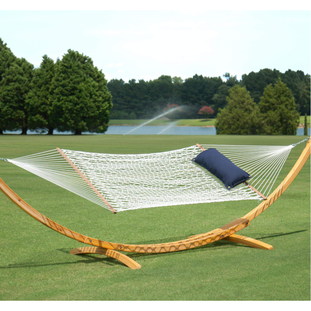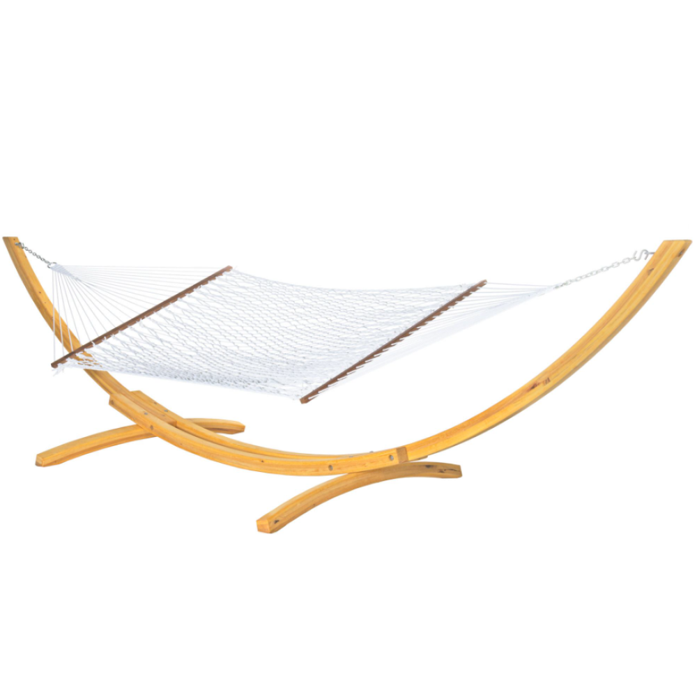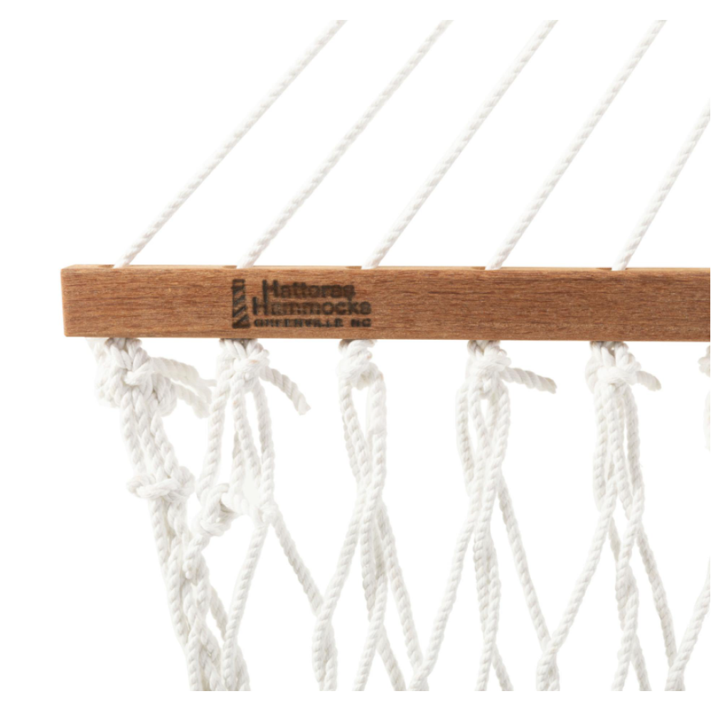 Spreader bars are constructed of unfinished South American cumaru, of the densest and handsomest woods in the world, for premium durability and strength. Spreader design enhances gentle swaying motion. Hatteras Hammocks® logo is branded on each spreader bar, representing strength and durability of Cape Hatteras Lighthouse. Hammock comes complete with superior constructed hardware. Heavy-duty zinc chromate hardware resists rust. One piece welded ring and chain prevents loss of hardware and provides for easy adjustment of hammock height. Two inch diameter ring and welded chain ensure safety. Zinc-plated eyebolt and hook assembly is the largest in the industry for added protection and strength.